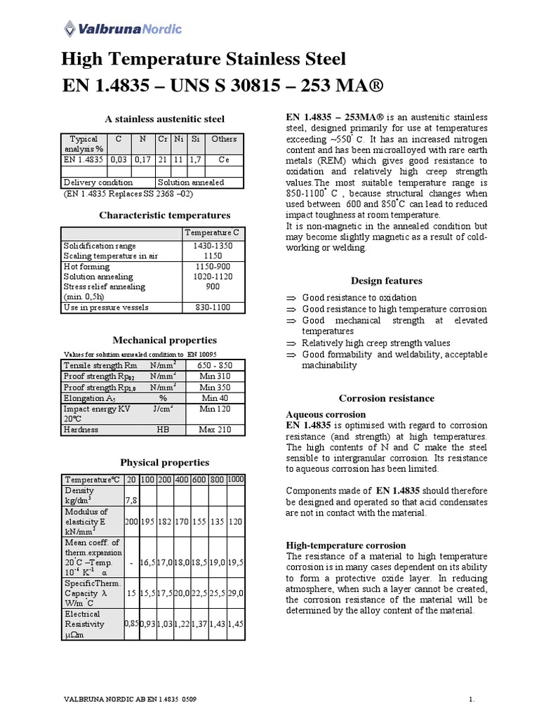 Its balanced chemical compositions give this steel the optimum overall performance under temperature range of 850 c 1100 c and extremely high oxidation resistance. 253ma is a trademark owned by outokumpu stainless ab.